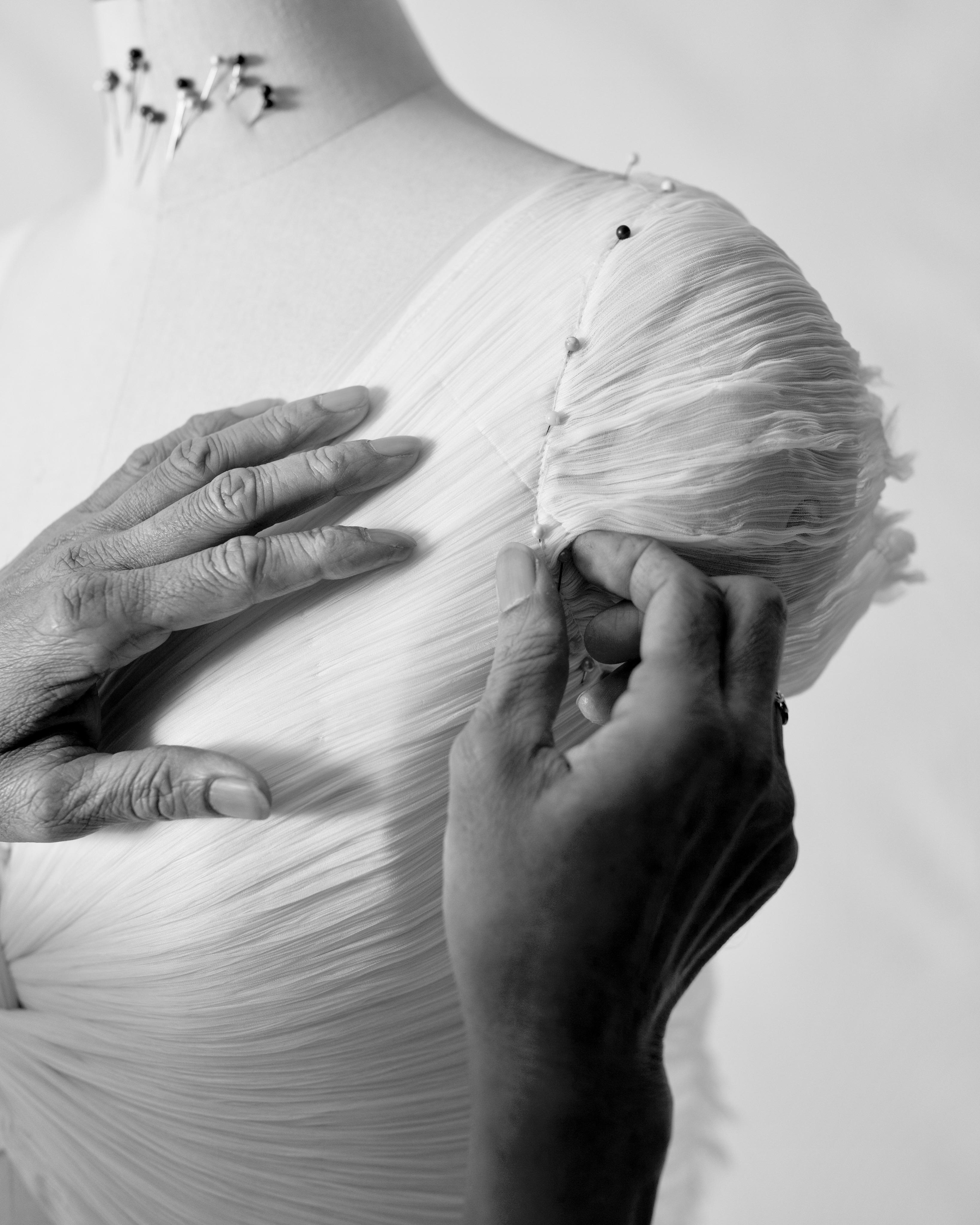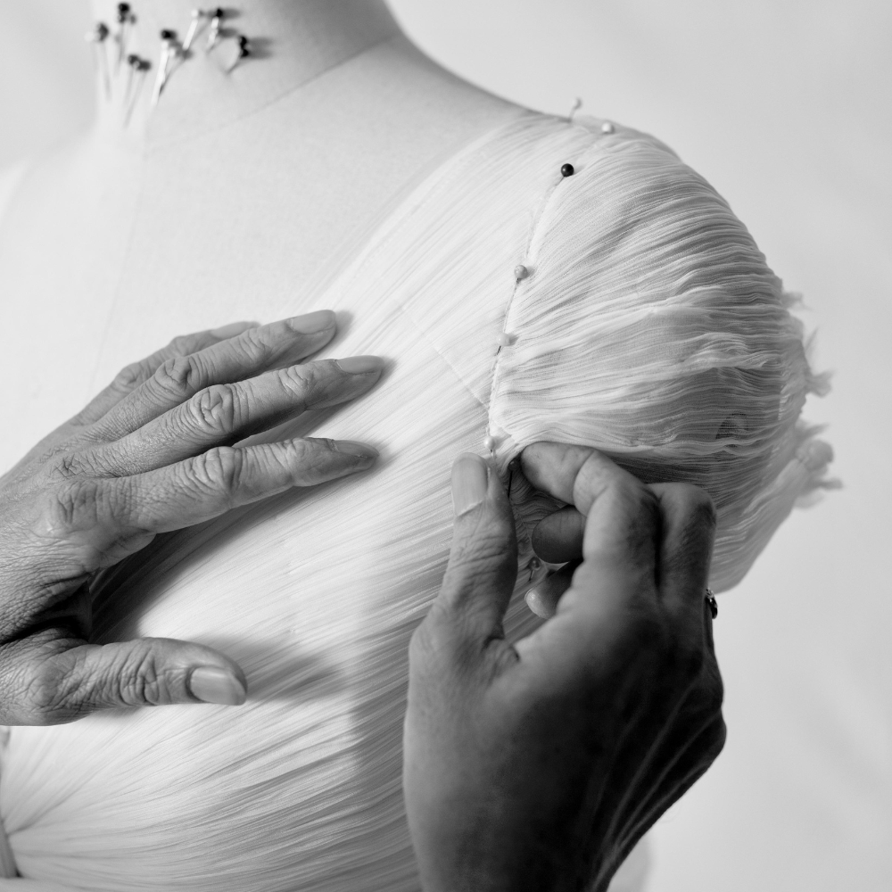 The brand collaborates with master craftspeople across India - from the weavers of Bengal and Bhuj to small local cooperatives - whose unique skills give each garment its sculptural form. Each of Aroka’s signature surface textures, whether ruched, smocked, or draped by hand, reflect hours of patience and precision. These time-intensive techniques are the essence of slow creation, celebrating the human hand’s artistry.