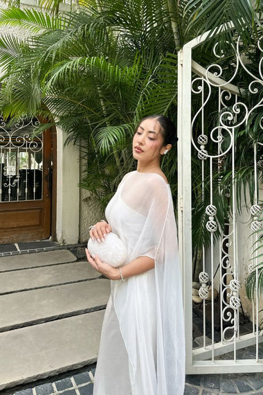 - Cut from lustrous Mashru silk with a soft, fluid drape with a sheer asymmetric cape in airy wrinkled chiffon