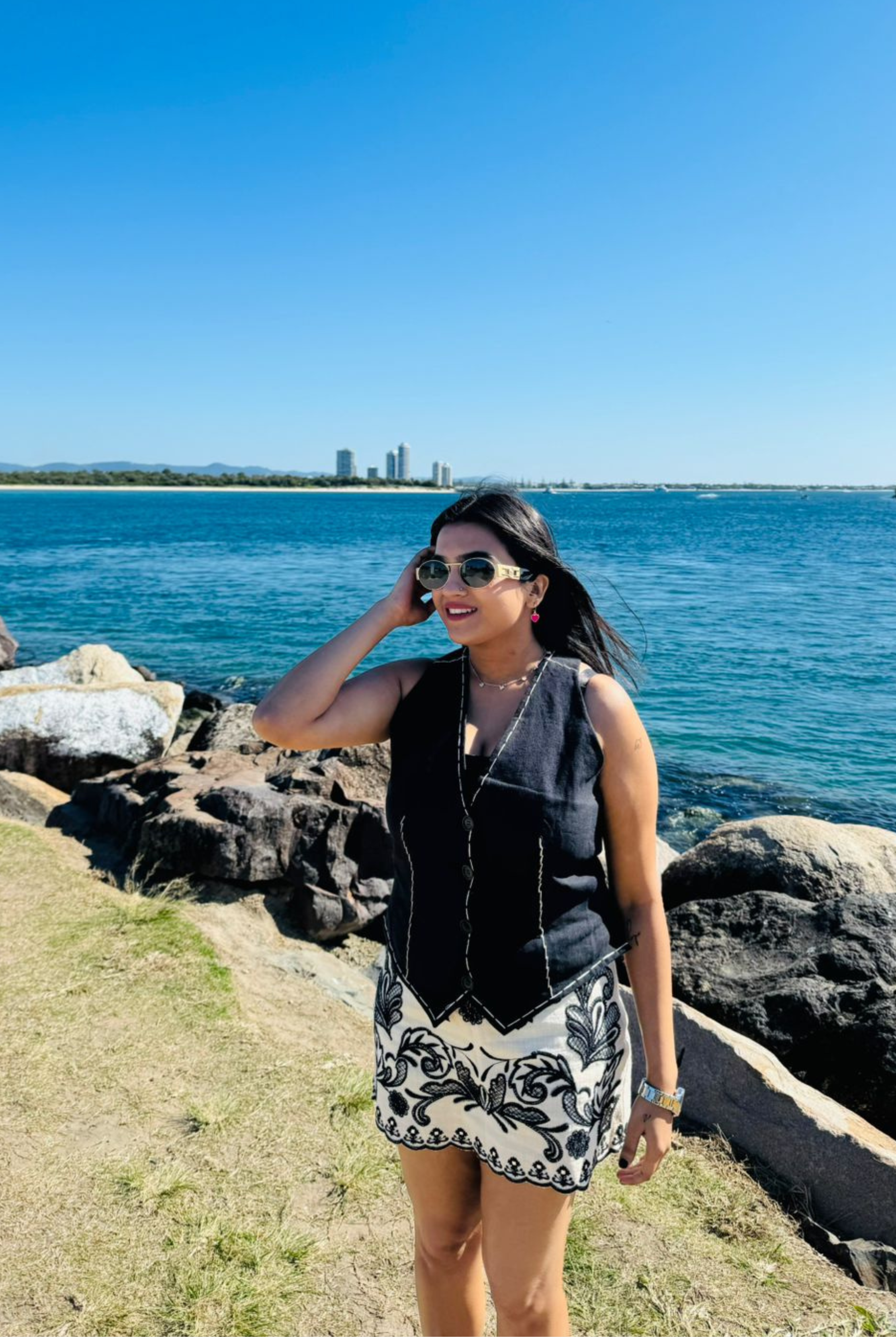 Please remember to dry clean our garments for the best care, and shield them from direct sunlight to prevent color variation. Initial washes of hand-dyed items may exhibit color bleeding, which stabilizes over time, creating graceful fades. Additionally, handwoven fabrics like muslin can have tiny black spots and thin thread lines that are natural hallmarks of their beauty and craftsmanship. Embrace these unique qualities that make each piece special.