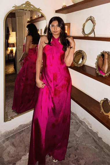 - Pink and deep red distorted tie-dye pattern adds a bold, statement touch