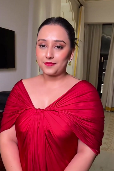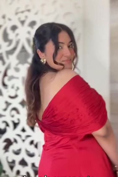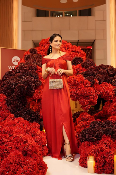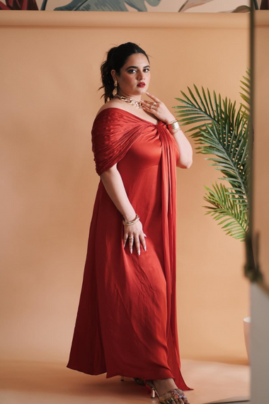 - Off-shoulder silhouette crafted in rich cherry red modal satin