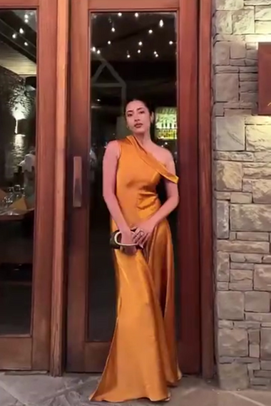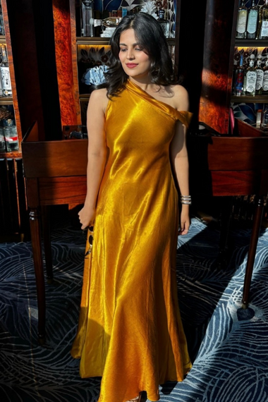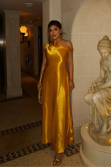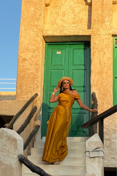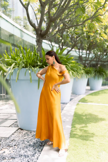 The golden dusk dress is made in vegan mashru and has a a sleek, minimalist design with an off-shoulder neckline that shows off the shoulders and neckline. The bias cut of the dress creates a smooth and flowing silhouette flattering the figure and creating a graceful, elegant look.