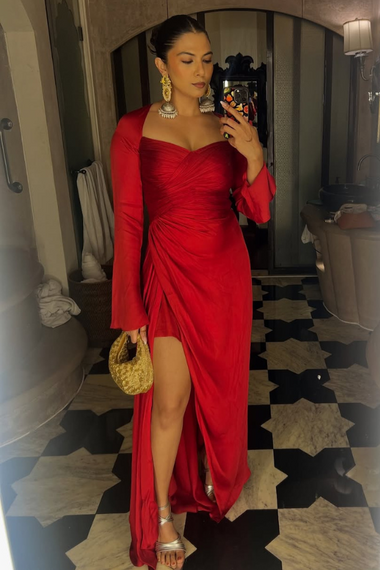 - Draped, fitted silhouette that highlights timeless elegance with a modern edge