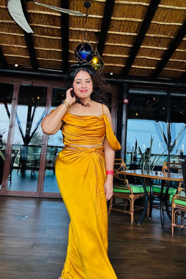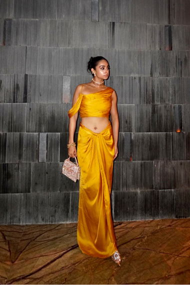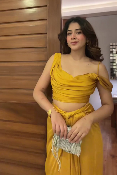 Introducing our Mustard Crop Top, a stunning piece that exudes elegance and style. This beautifully sculpted top fits like a glove, featuring a detachable draped sleeve and an elegant cowl neckline for a sophisticated touch. The mustard color complements every skin tone, adding a radiant glow to your look. Elevate your wardrobe with this versatile and chic crop top, perfect for making a statement at any occasion.