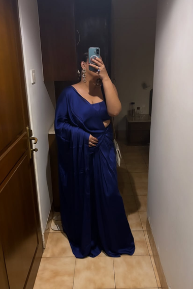 This vegan modal satin pre-draped saree is perfect for Diwali parties, wedding occasions, or any Indian festivities. Effortlessly embody the modern Indian diva with this back zip-up saree, designed for easy elegance. Featuring a front overlap and draped pleating that beautifully replicates traditional saree draping without the excess bulge of fabric around the waist. With a fitted waistband and comfortable lining attached, it combines comfort with a refined look. Pre-stitched for easy wear, this saree is the epitome of grace and style, making it an elegant choice for any occasion.