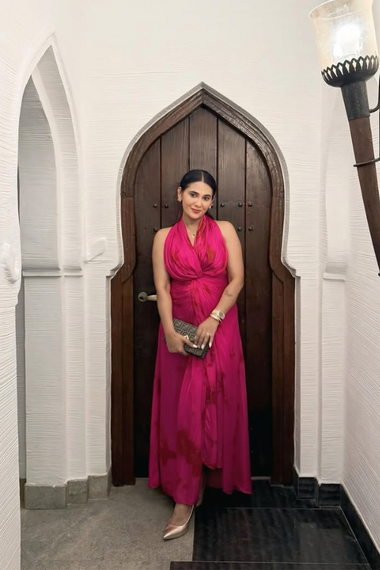 - Distorted pink and deep red tie-dye creates a bold yet refined statement