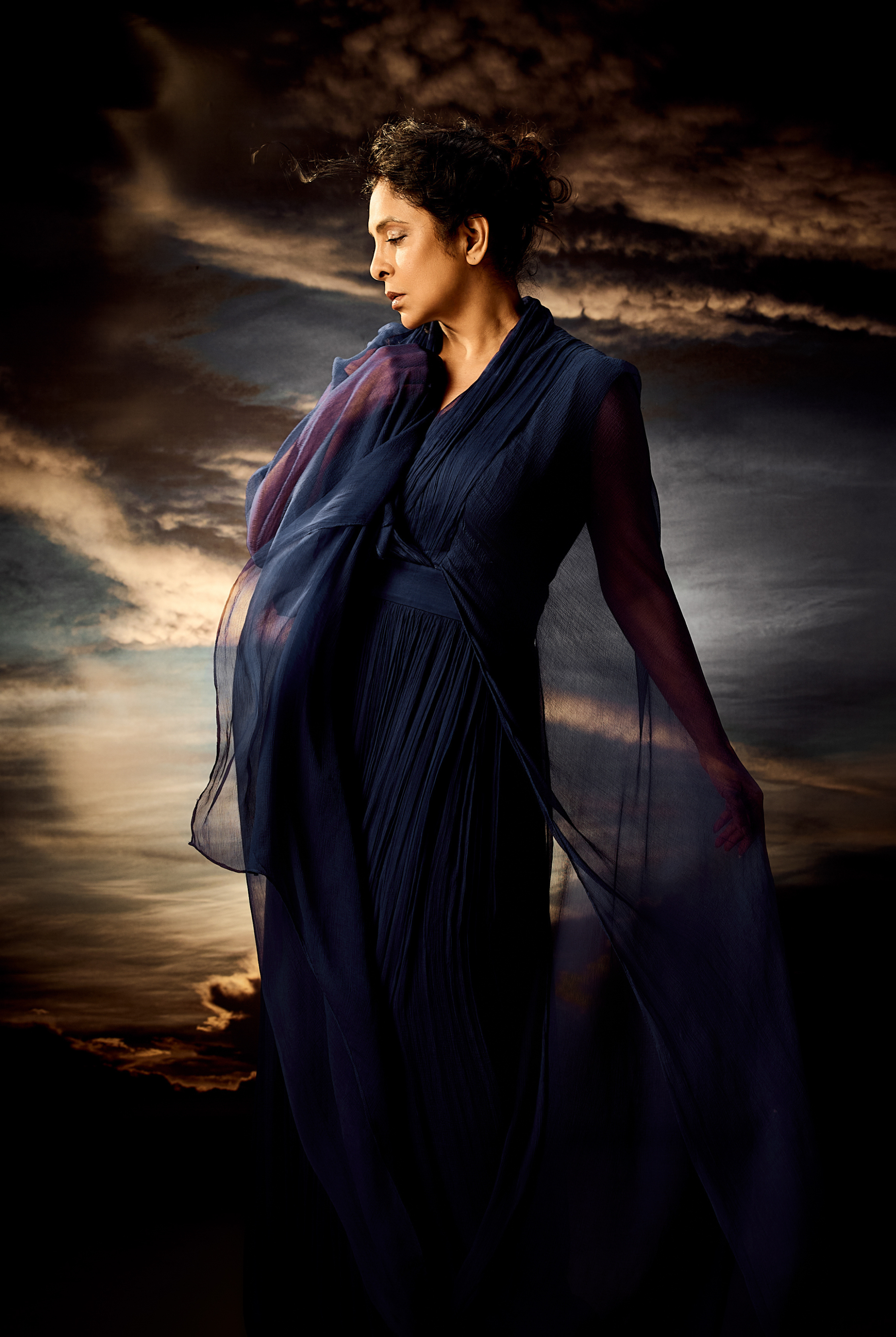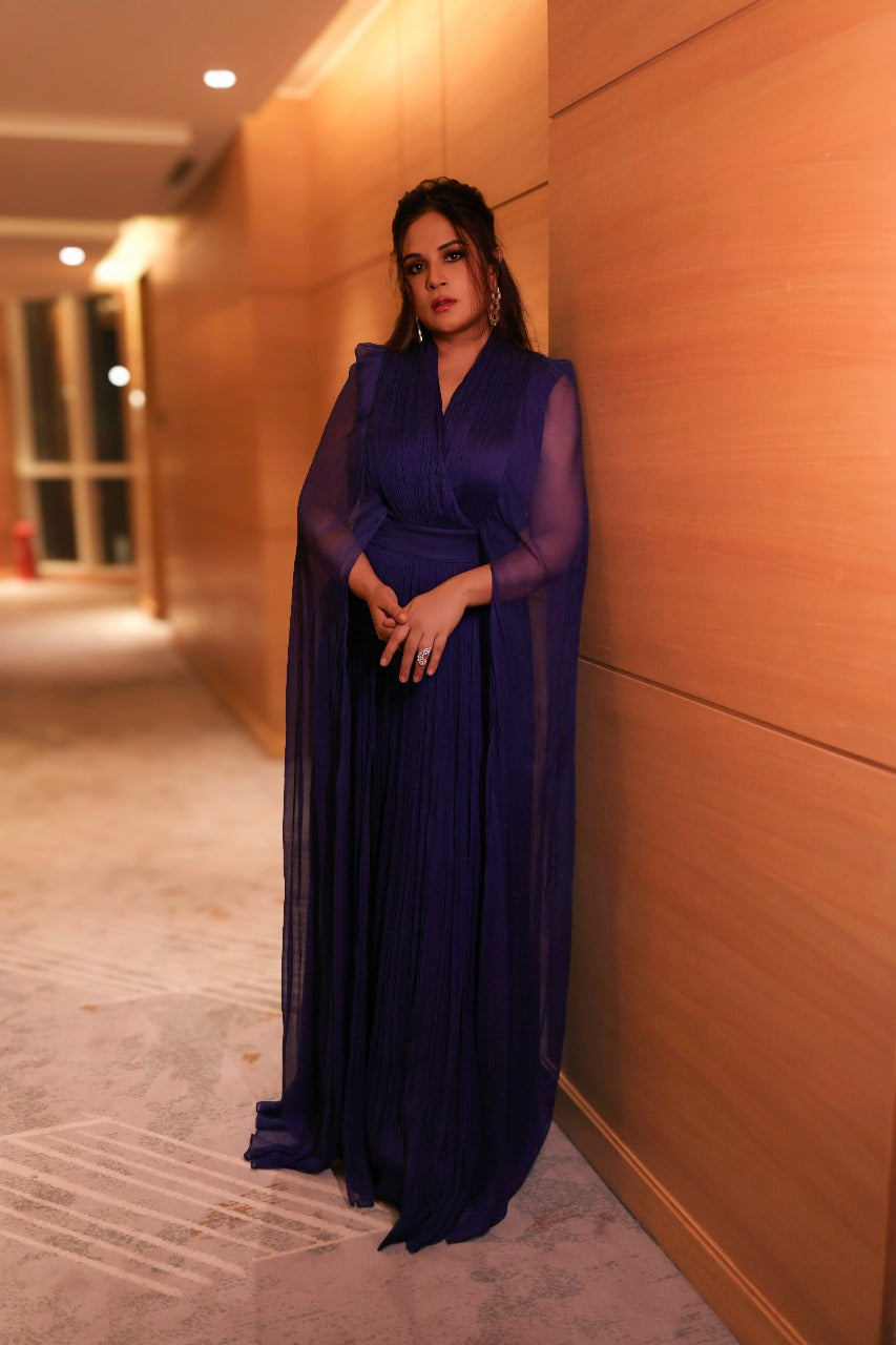 - Gathered chiffon panels add volume, movement, and dramatic flow
