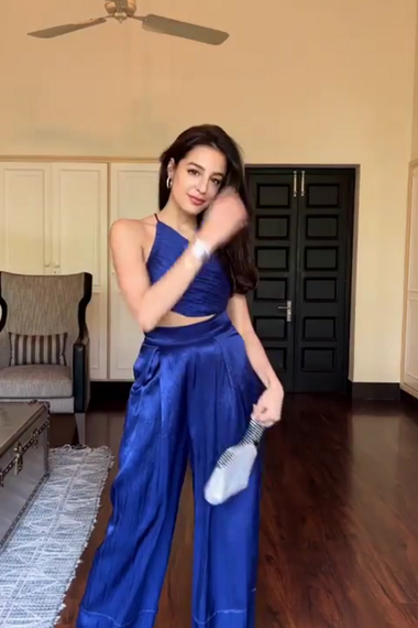 - Paired with high-waisted pleated pants in lustrous vegan mashru