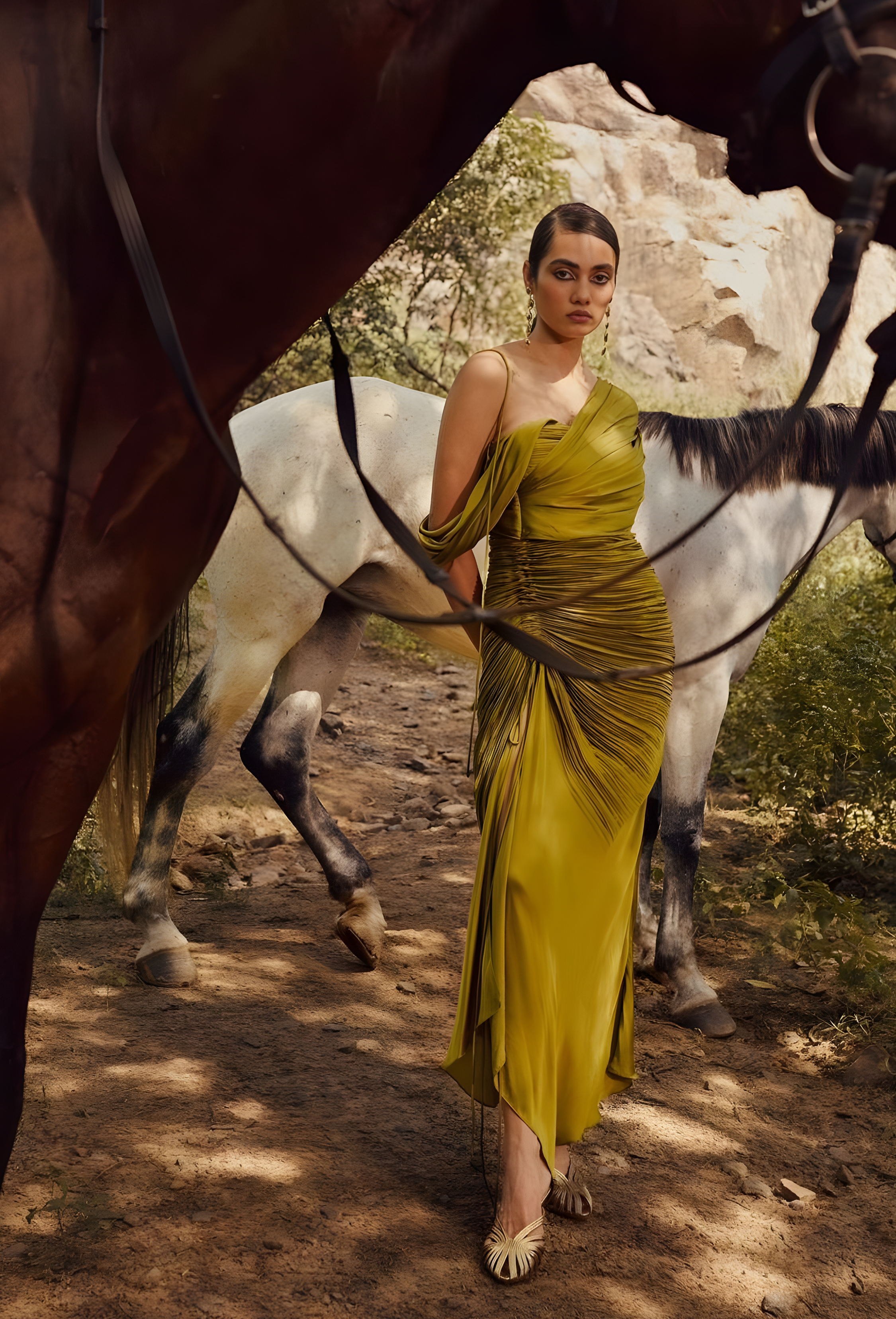 - A full-length olive green dress that captures warmth, elegance, and ease