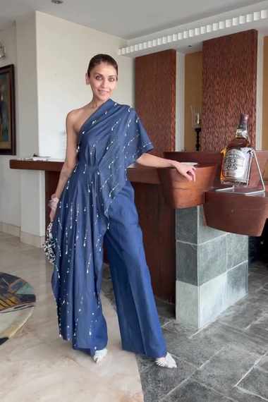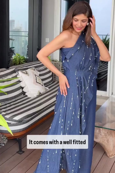 - One-shoulder draped silhouette crafted in deep indigo denim with a foldover collar style