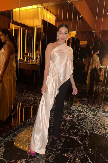 - Draped silhouette enhanced with delicate hand-embroidered smocking details