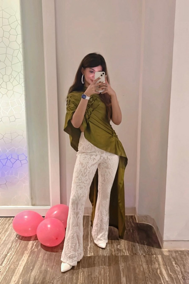 - Off-shoulder asymmetric top crafted from handmade vegan mashru