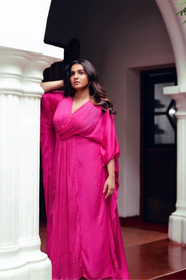 - Ruched V-neckline adds definition to the flowing kaftan silhouette