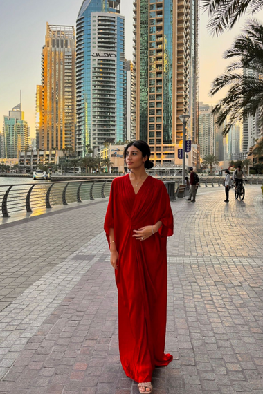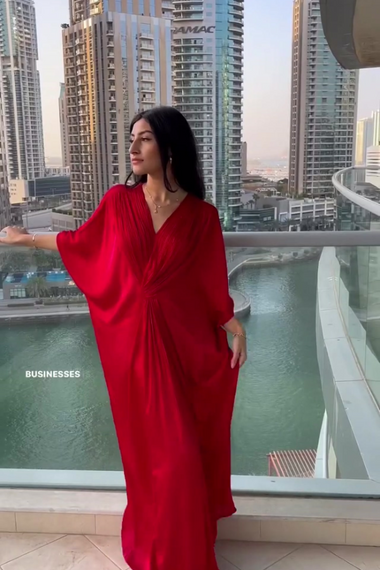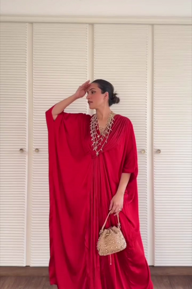 Comfortable modal satin Ruched V-neckline Kaftan Dress in Red from Aroka