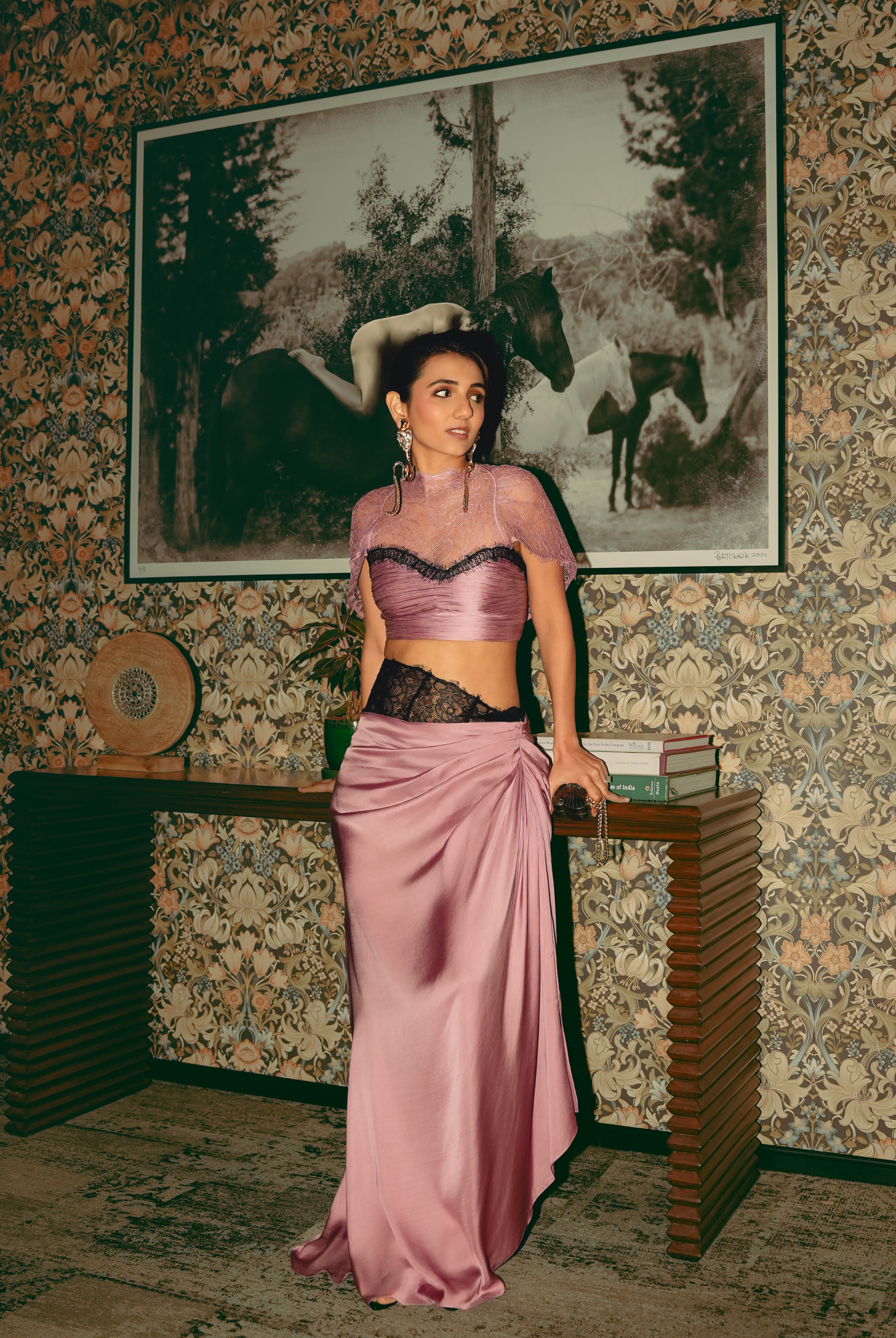 Rosette Set is a romantic designer co-ord set for women, crafted in dusty pink modal satin and lace, blending sculpted texture with a fluid, graceful drape.