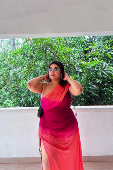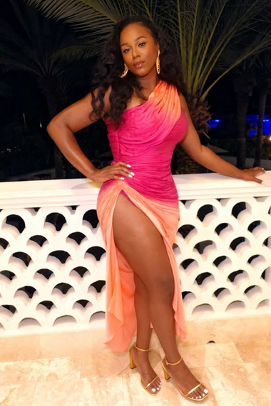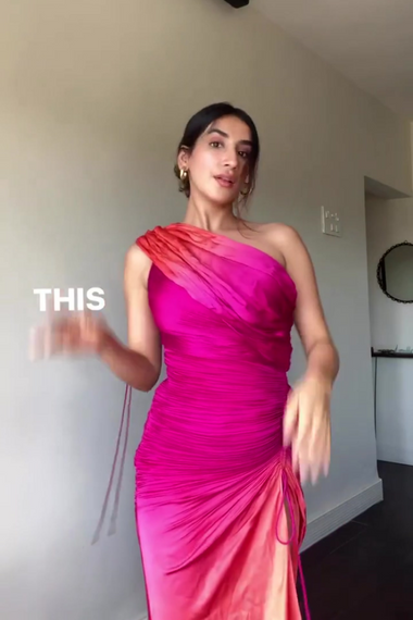 - Signature ruching with adjustable drawstrings at the shoulder and side slit